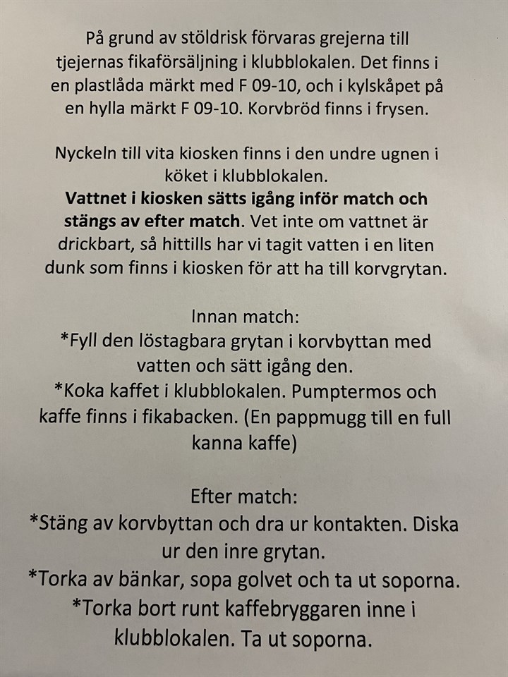 Säsongen närmar sig sitt slut och tjejerna har två hemmamatcher kvar. Fikaförsäljning för dessa matcher har: 30/8 Emelie och Lilas 27/9 Alice och Ella Man ansvarar själv för att byta om man inte kan. Var på plats i tid (30 min innan match) för att hinna förbereda. Det är ingen korvförsäljning dessa två matcher, men fikabröd ska finnas till försäljning, köpt eller hembakt. Båda i "fikaparen" har med varsin sort. En av dem får gärna vara gluten-och mjölkfri. Fikabacken samt drickor finns i klubblokalen, allt är märkt med F09-10. (Drickorna är i kylen) Nyckeln till vita kiosken finns i den nedre ugnen i klubblokalen. Innan matchen kokar man kaffet i klubblokalen. Pumptermos och kaffe finns i backen. (En pappmugg med kaffe till en full kanna med vatten) Efter matchen torkar man av bänkarna, sopar golvet och tar ut soporna från vita kiosken. Kom ihåg att låsa! Diska även bort och torka runt kaffebryggaren i klubblokalen, samt ta ut soporna även där. Har jag varit otydlig eller om ni har några funderingar är det bara höra av sig😊