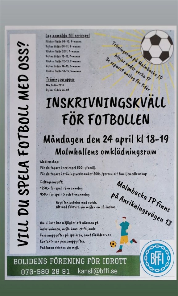 Hej På måndag 24/4 är det inskrivning se bild för info. F 09-11Fotboll 20 apr 2023 0kommentarer